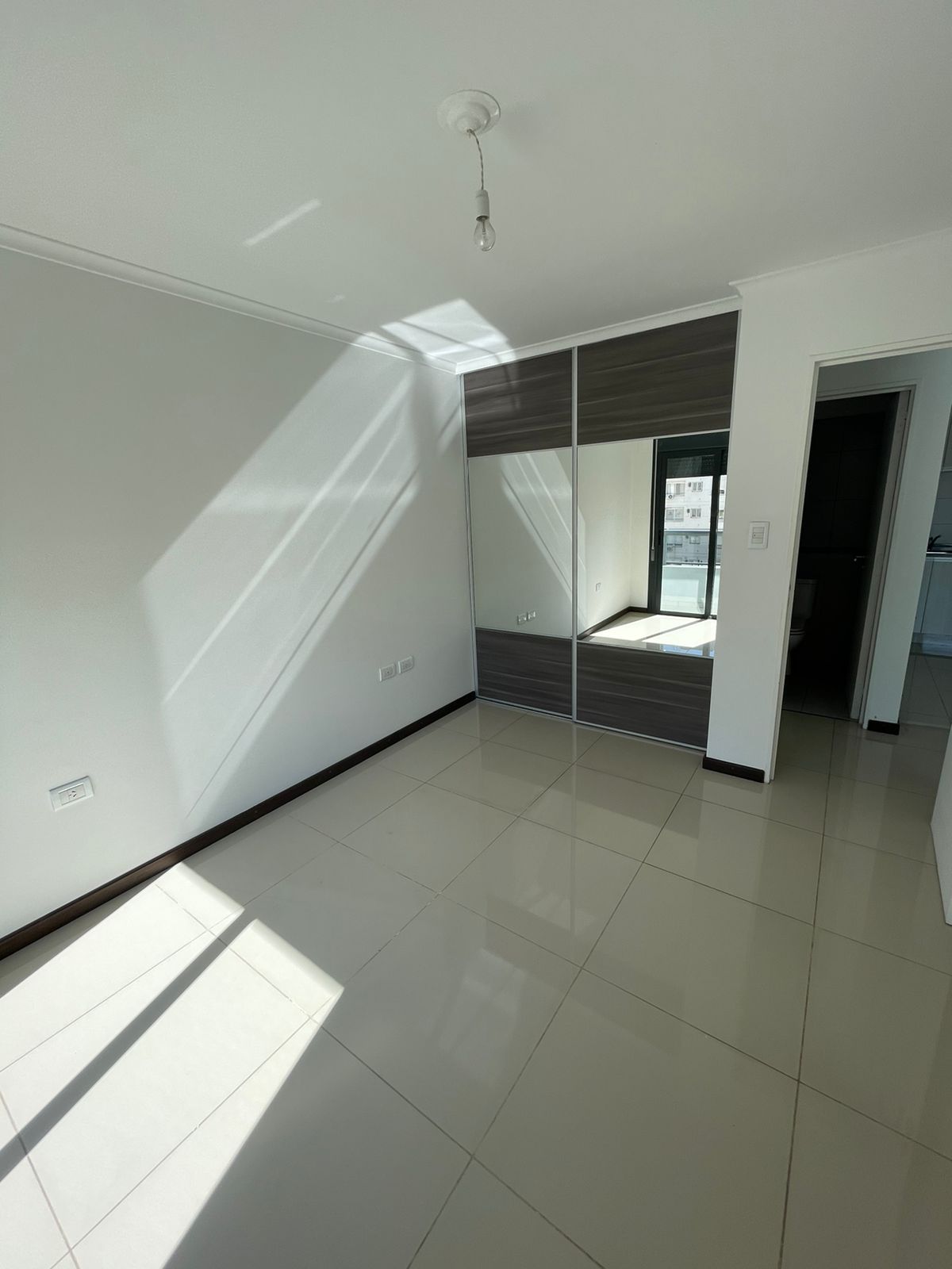 Dormitorio: placard con puertas espejadas, interiores completos y mueble de respaldo de cama, también con salida al balcón